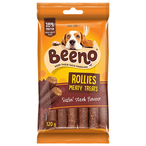 Packed with moreish meat and Omega 6, Beeno Rollies Steak Treats will have your dog wagging their tail for more. With added fibre for easy digestion, our lip-smacking treats make great daytime snacks or rewards for good behaviour. Suitable for all adult dogs. Available in 120g.